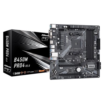 ASRock B450M Pro4 R2.0 Super Alloy AMD AM4 Socket Motherboard, Micro-ATX, 4x DDR4 Slots, 2x M.2 Sockets, GbE LAN, 1x D-Sub / 1x DVI-D / 1x HDMI Port